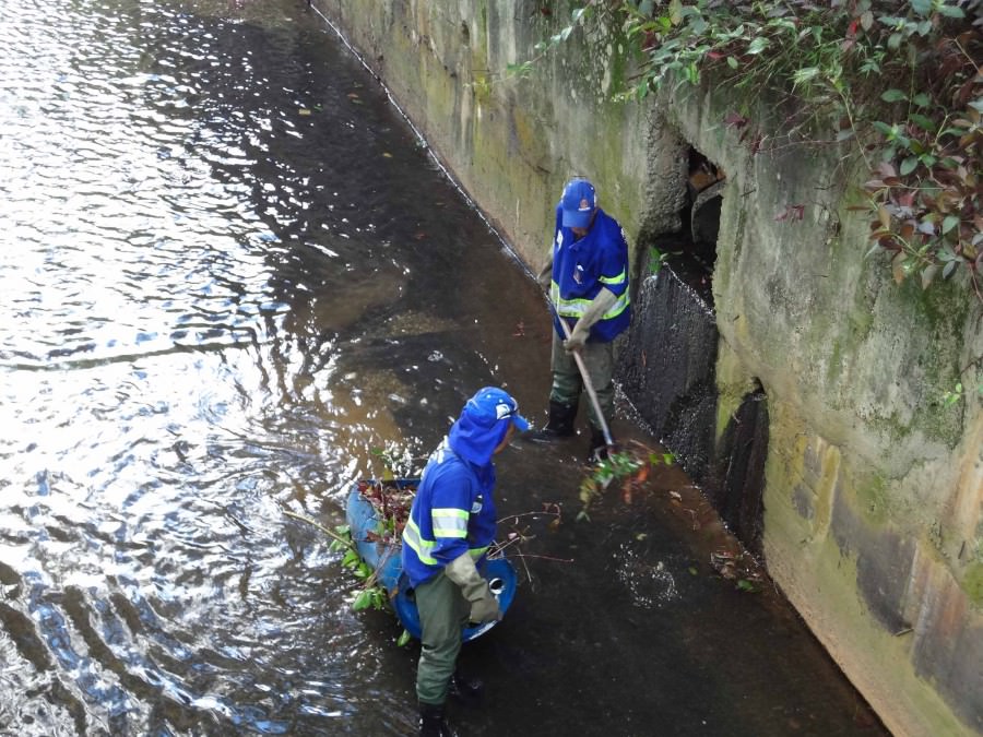 Legenda Foto 1: Rio Belém no Bosque do Papa (Curitiba / PR) / Foto de: Maristela Ono; Foto 2) Funcionários da Prefeitura Municipal de Curitiba realizando limpeza no Rio Belém, no bosque do Papa / Foto de: Maristela Ono