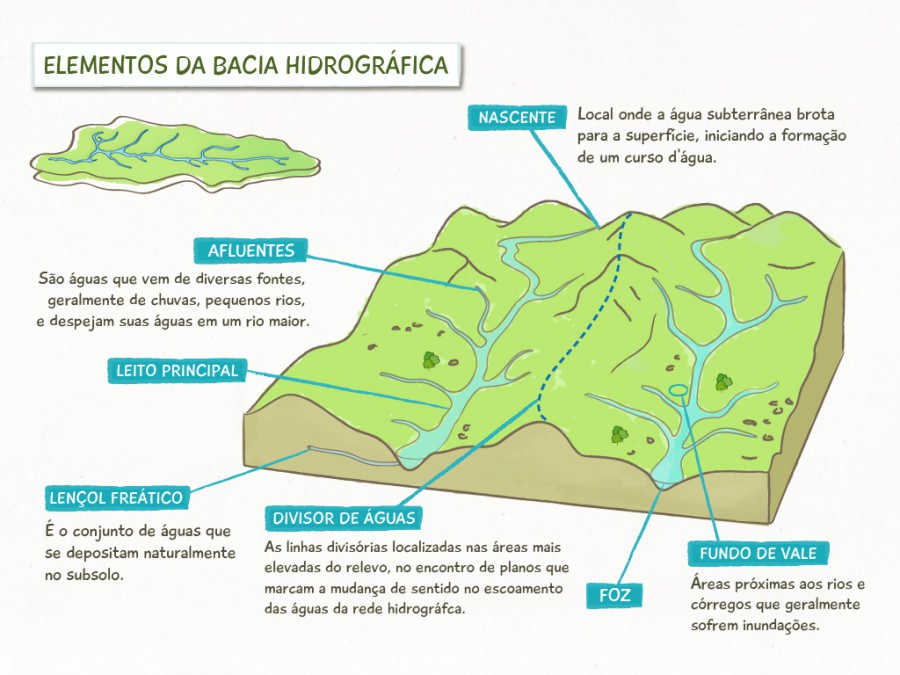 Bacias hidrográficas são áreas da superfície terrestre separadas topograficamente entre si pelos chamados divisores de águas. Essas áreas fazem a recepção natural das águas das chuvas, que escoam por meio da rede hidrográfica, ou rede de drenagem (captação), que é formada por diversos cursos d’água: córregos, ribeirões, rios, etc. As águas escoam das áreas mais altas para as mais baixas do relevo, até concentrarem-se na parte mais baixa, formando um rio principal Os rios que deságuam no rio principal chamam-se afluentes, e os que deságuam nestes últimos são os subafluentes.
